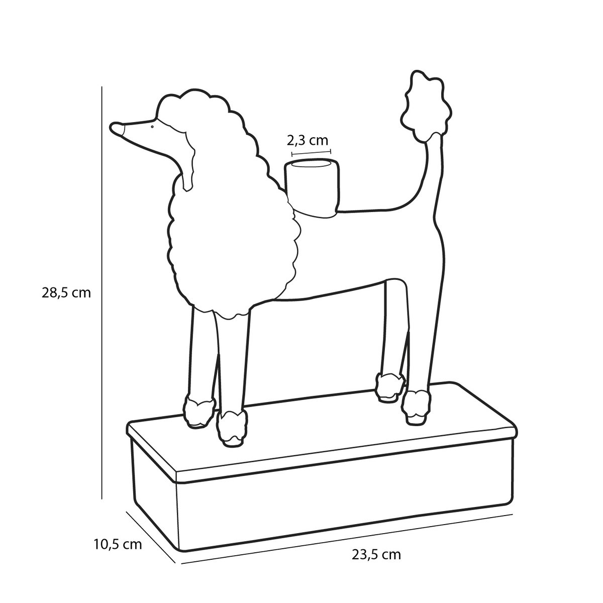 Op zoek naar een opvallend statement piece? Dan is deze kandelaar van Mica Decorations wat je zoekt! Met de kaarshouder, in de vorm van een poedel en op een gestreept plateau, vang je gegarandeerd blikken. De kaarsenstandaard is van keramiek en heeft een glanzende afwerking, prachtig! De bijzondere kandelaar heeft een lengte van 23,5 cm, een breedte van 10,5 cm en een hoogte van 28,5 cm en is geschikt voor een dinerkaars van 2,2 cm. Geef je interieur een eigenzinnige touch!